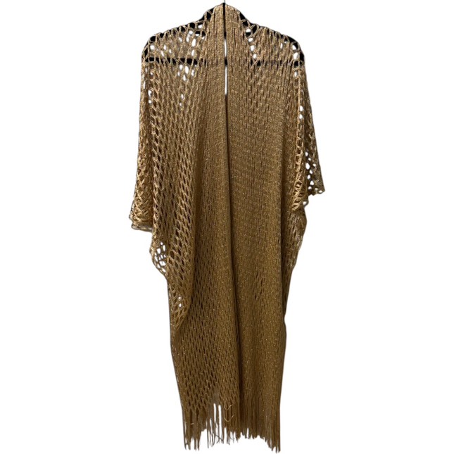 Μονόχρωμο ριχτό καφτάνι/κιμονό με μανίκια, σε ανοιχτή πλέξη – σχέδιο δίχτυ. Τα κρόσσια στο τελείωμα προσθέτουν μία boho ξεχωριστή πινελιά και η ασημοκλωστή του δίνει μια διακριτική λάμψη.
