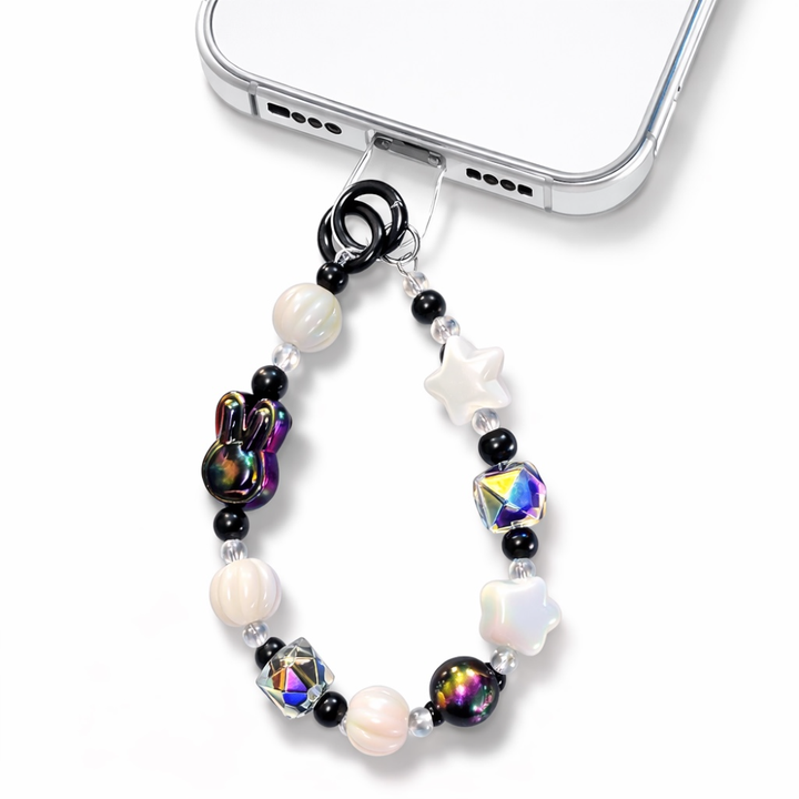 Αλυσίδα-μπρελόκ κινητού με διακοσμητικές χάντρες και μεταλλικό γαντζάκι.